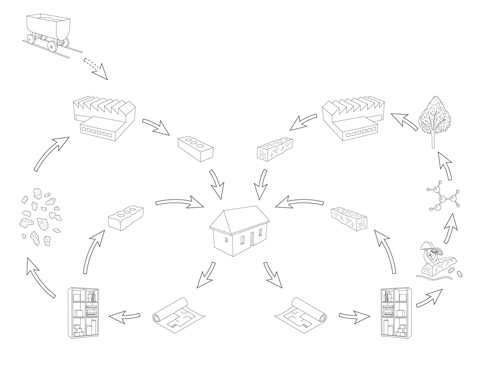A distinction must be made between the biological and technical cycle. The technical cycle comprises all materials and products that consist of raw materials extracted from the earth’s crust, e. g. petroleum-based plastics or metals. These materials or products can – if they have been correctly designed, constructed or manufactured – be re-used after a cycle has ended, or sorted by type and recycled. They thus become a valuable resource for new products. The biological cycle comprises all materials or products produced by photosynthesis and represents a much larger metabolism. While the plastic polyethylene, for example, must always be reused as such in the same cycle, an untreated wooden beam can decompose in the biological cycle and provide nutrients for a mushroom insulation.