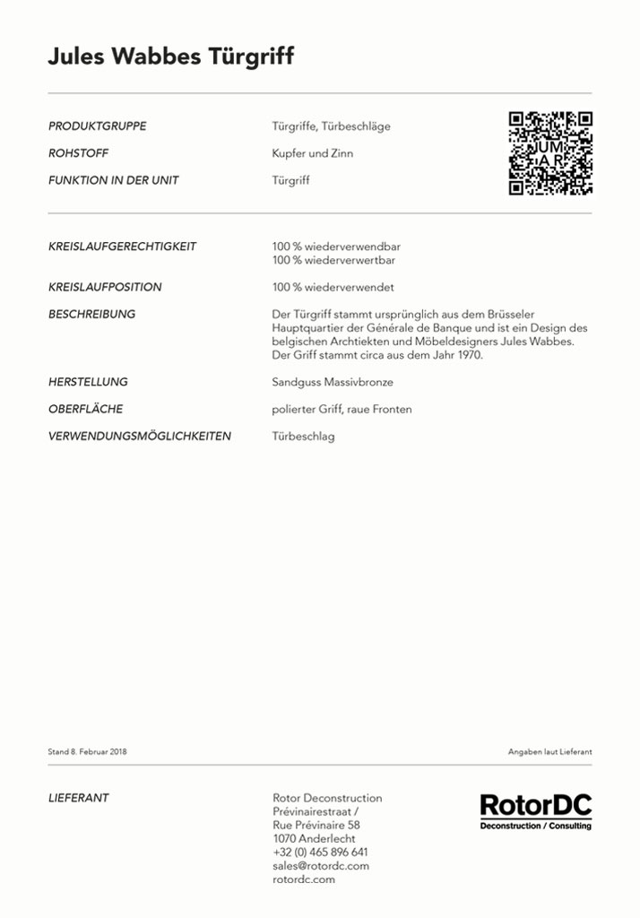 The door handle originates from the Brussels headquarters of the Générale de Banque and is a design of the architect and furniture designer Jules Wabbes. The handle dates from around 1970.