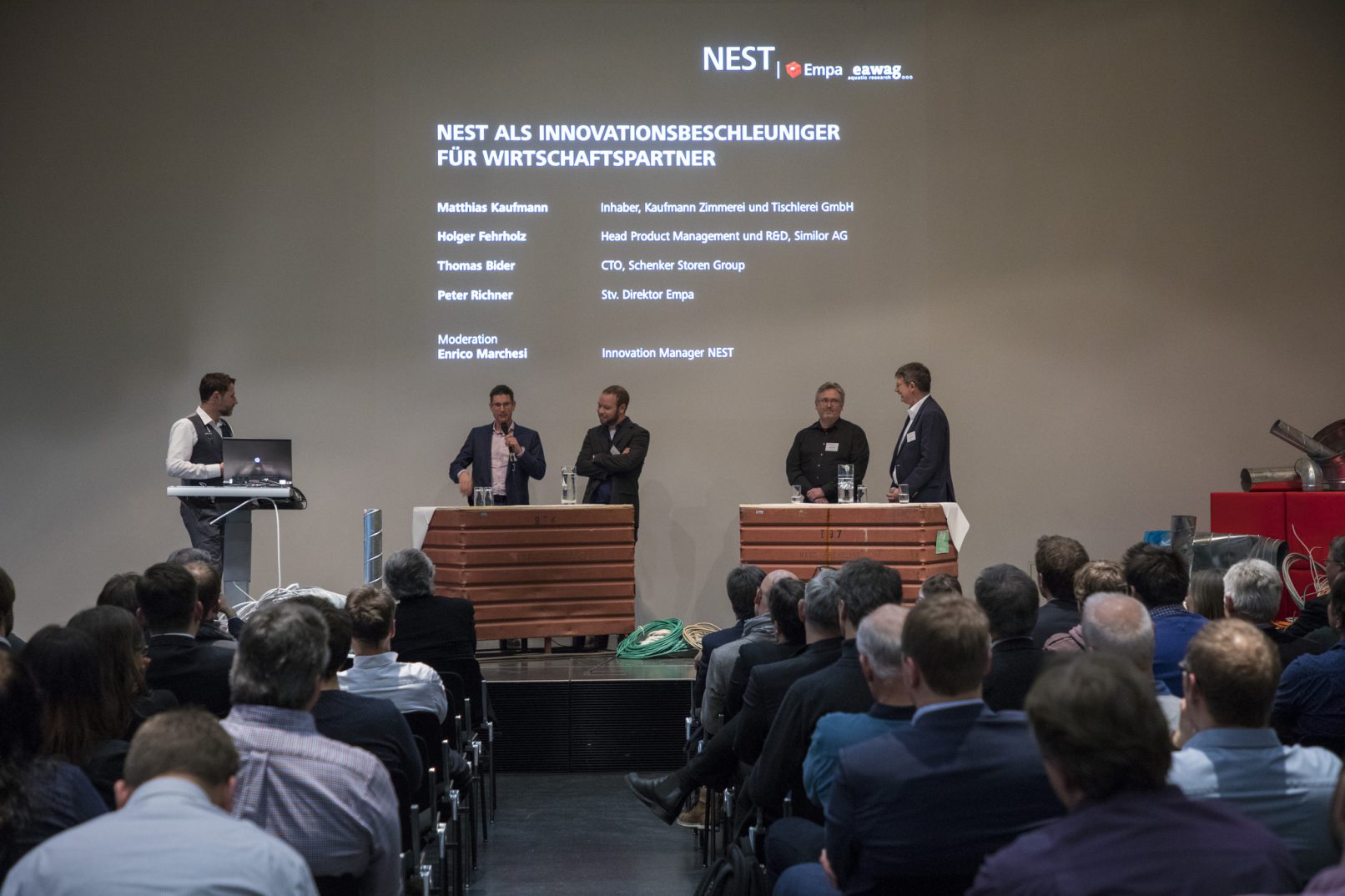 NEST Innovation Manager Enrico Marchesi, CTO Schenker Storen Thomas Bider, Inhaber Kaufmann Zimmerei und Tischlerei Matthias Kaufmann, Head Product Management Similor AG Holger Fehrholz, Stv. Direktor Empa Peter Richner (Photo Empa)