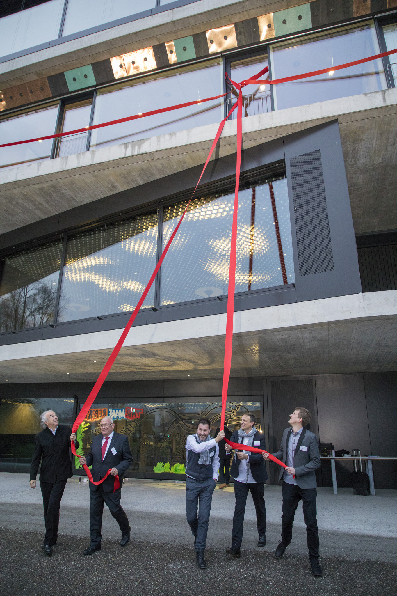 Prof. Dr. Werner Sobek, Government councillor of the Canton of Zurich Markus Kägi, NEST Innovation Manager Enrico Marchesi, Prof. Dirk E. Hebel and Felix Heisel (Photo Empa)