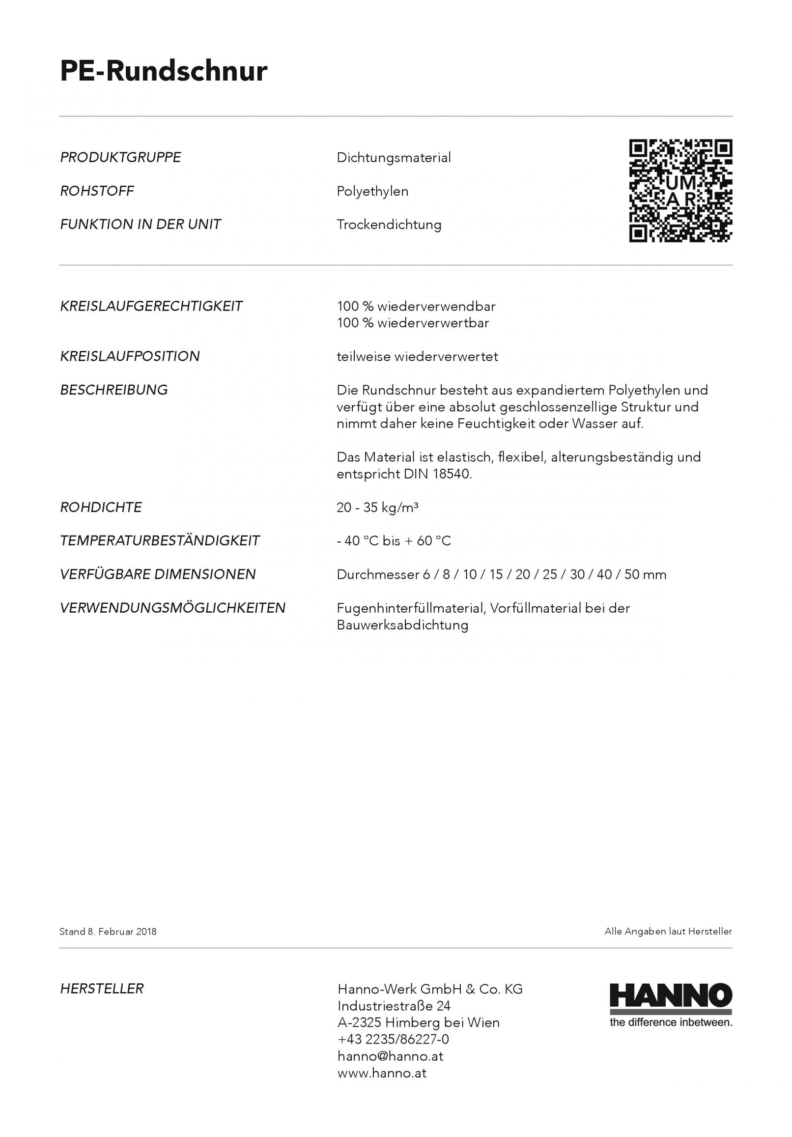 The round cord is made of expanded polyethylene and has an absolutely closed-cell structure and therefore does not absorb moisture or water. The material is elastic, flexible, resistant to aging and complies with DIN 18540.