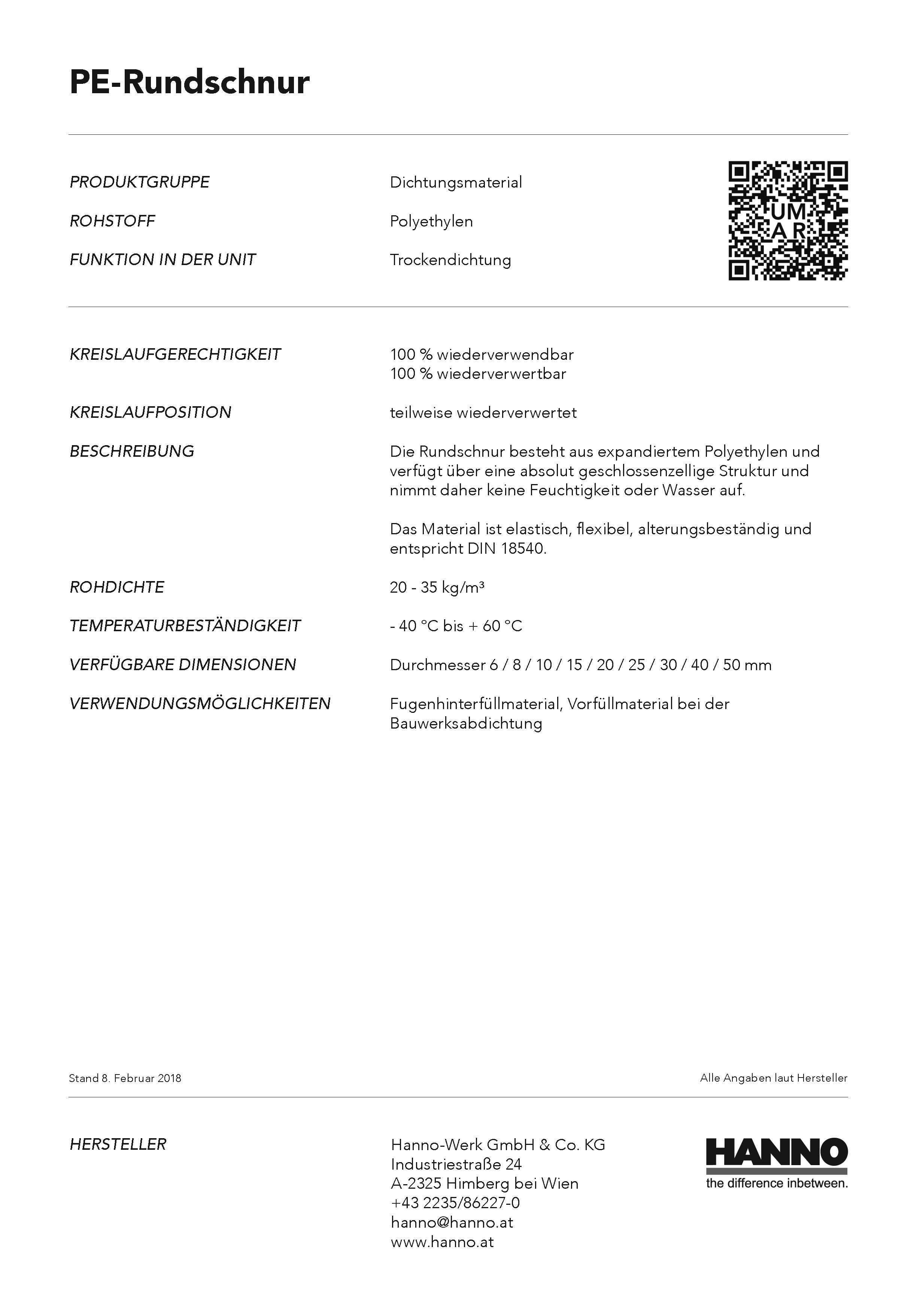 The round cord is made of expanded polyethylene and has an absolutely closed-cell structure and therefore does not absorb moisture or water. The material is elastic, flexible, resistant to aging and complies with DIN 18540.